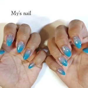 投稿日: 2025年8月15日2025年8月26日 投稿者: mai★グラデーションネイル★ ソフトジェル 3300円 追加2色(10本) 1100円 所要時間約1時間(オフ無し) 本日のデザインはターコイズブルーカラーのグラデーションとシルバーラメを根元からグラデーションです✨