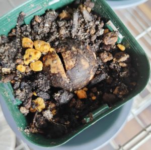 食べた野菜のクズは堆肥作りしていたのですが、その中に入れておいたアボガドの種が発芽してました(´゚д゚`)