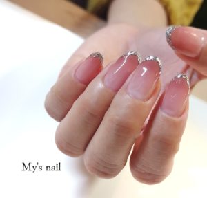 本日のデザインはピンクベージュのグラデーションにシルバーのガラスフレンチ✨
